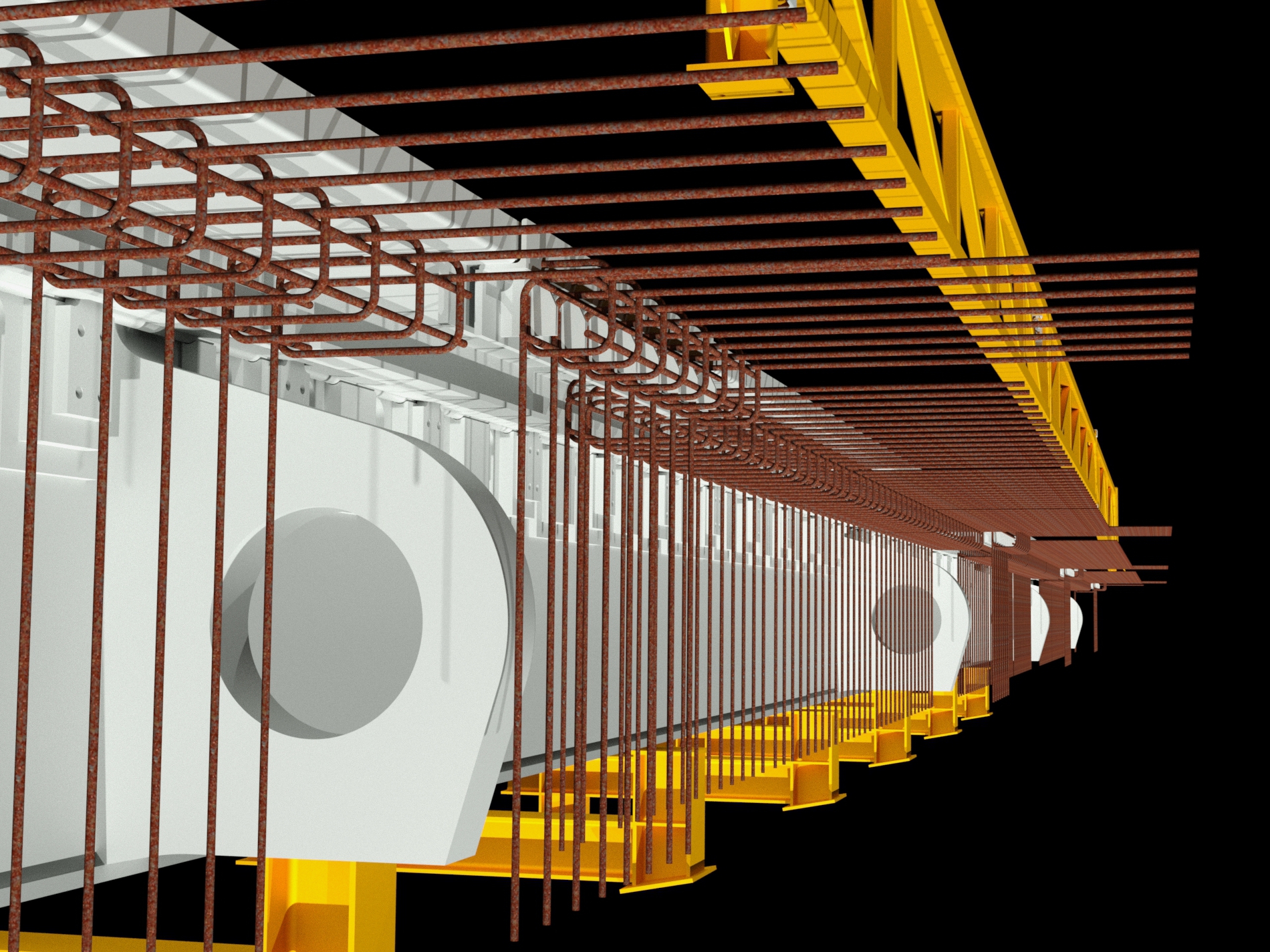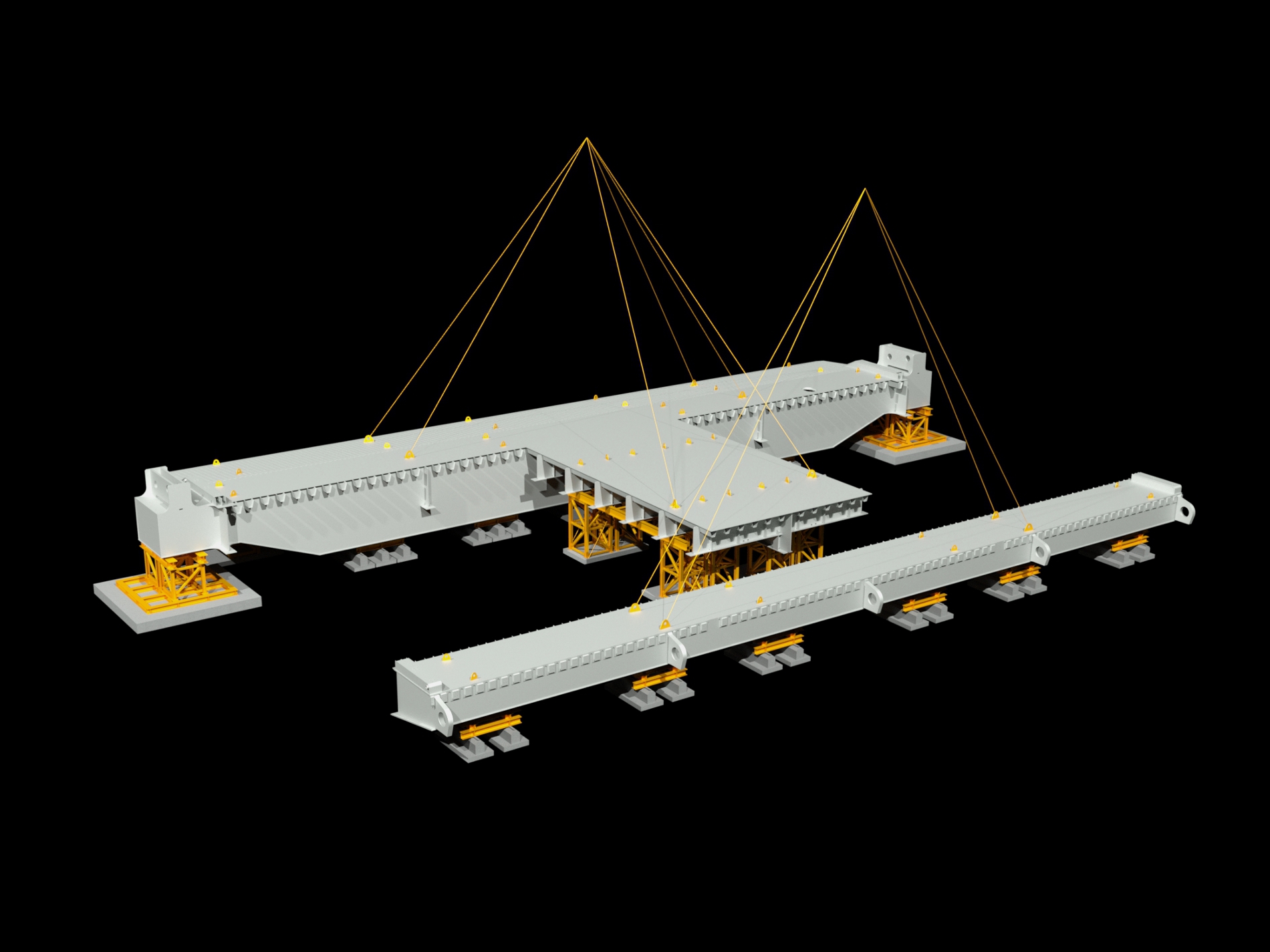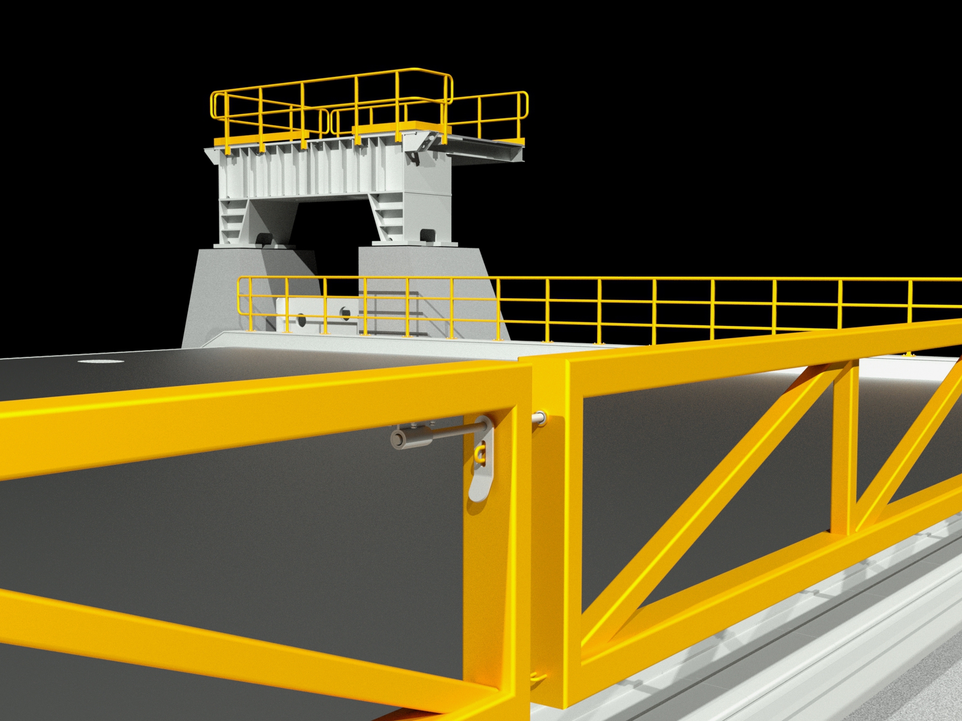 Projekt warsztatowy oraz projket montażu konstrukcji stalowej, pomostu ruchomego rampy Ro-Ro, realizowanej w ramach zadania inwestycyjnego: "Przystosowanie infrastruktury Terminalu Promowego w Świnoujściu do obsługi transportu intermodalnego". Projketowany pomost służy do załadunku i rozładunku jednostek pływających zacumowanych przy stanowsku promowym nr 5. Konstrukcję zaprojektowano w formie rusztu dźwigarów poprzecznych i podłużnych, z płytą ortotropową, z żebrami korytkowymi zamkniętymi, podpartą na poprzecznicach. Poprzecznice oparto na dźwigarach głównych, te z kolei oparte są, częściowo za pośrednictwem dźwigara poprzecznego podporowego, na łożyskach obrotowych na nabrzeżu (3 szt.) oraz od strony odwodnej, na dźwigarze poprzecznym, podwieszonym za pośrednictwem belki ryglowej do ramowych pylonów. Długość całkowita obiektu (głównego pomostu): 20,775 m, szerokość całkowita: 32,800 m. Konstrukcję zamodelowano i wytworzono z uwzględnieneim powierzchniowego podniesienia wykonawczego o wartości 16mm.
