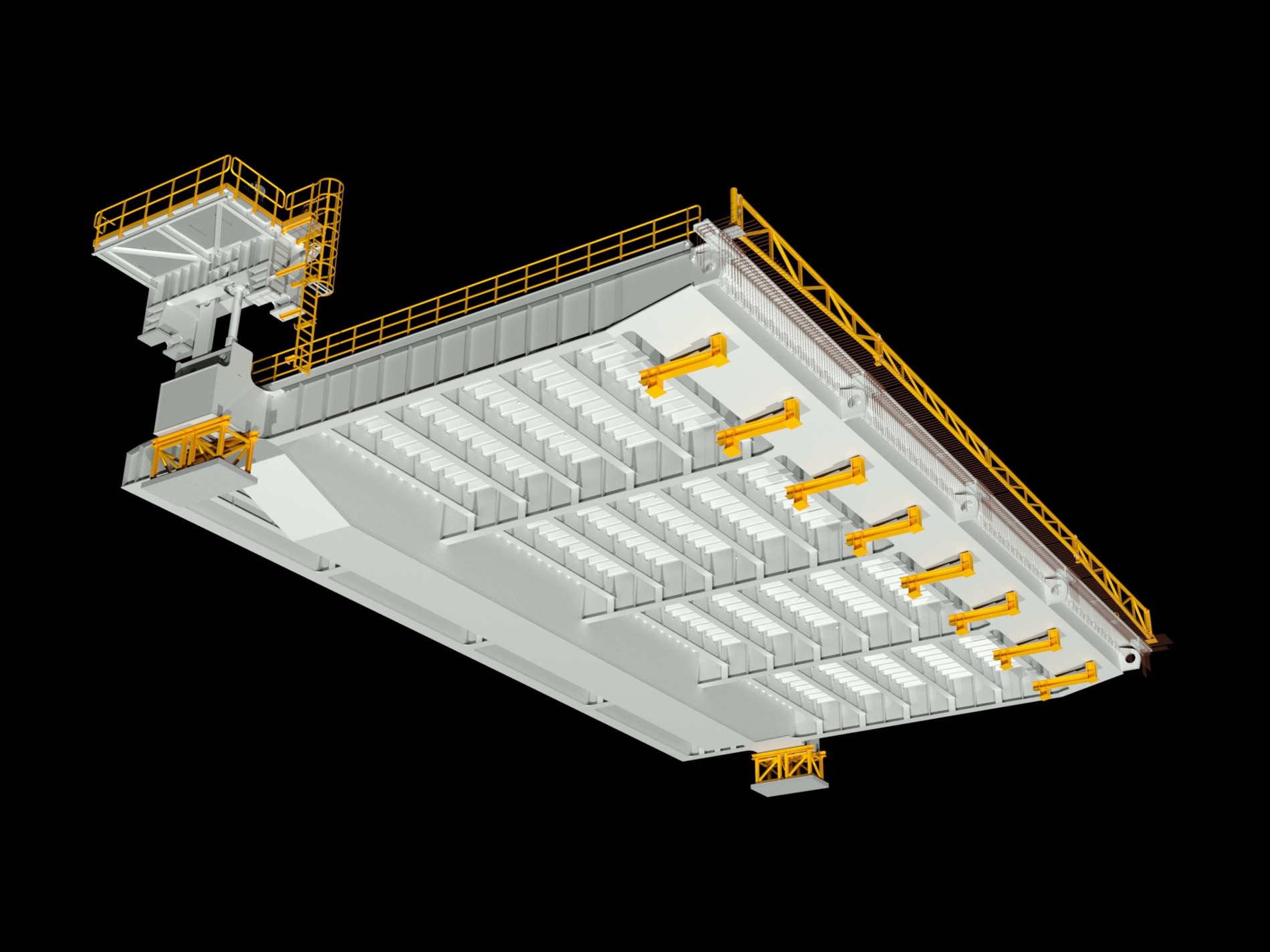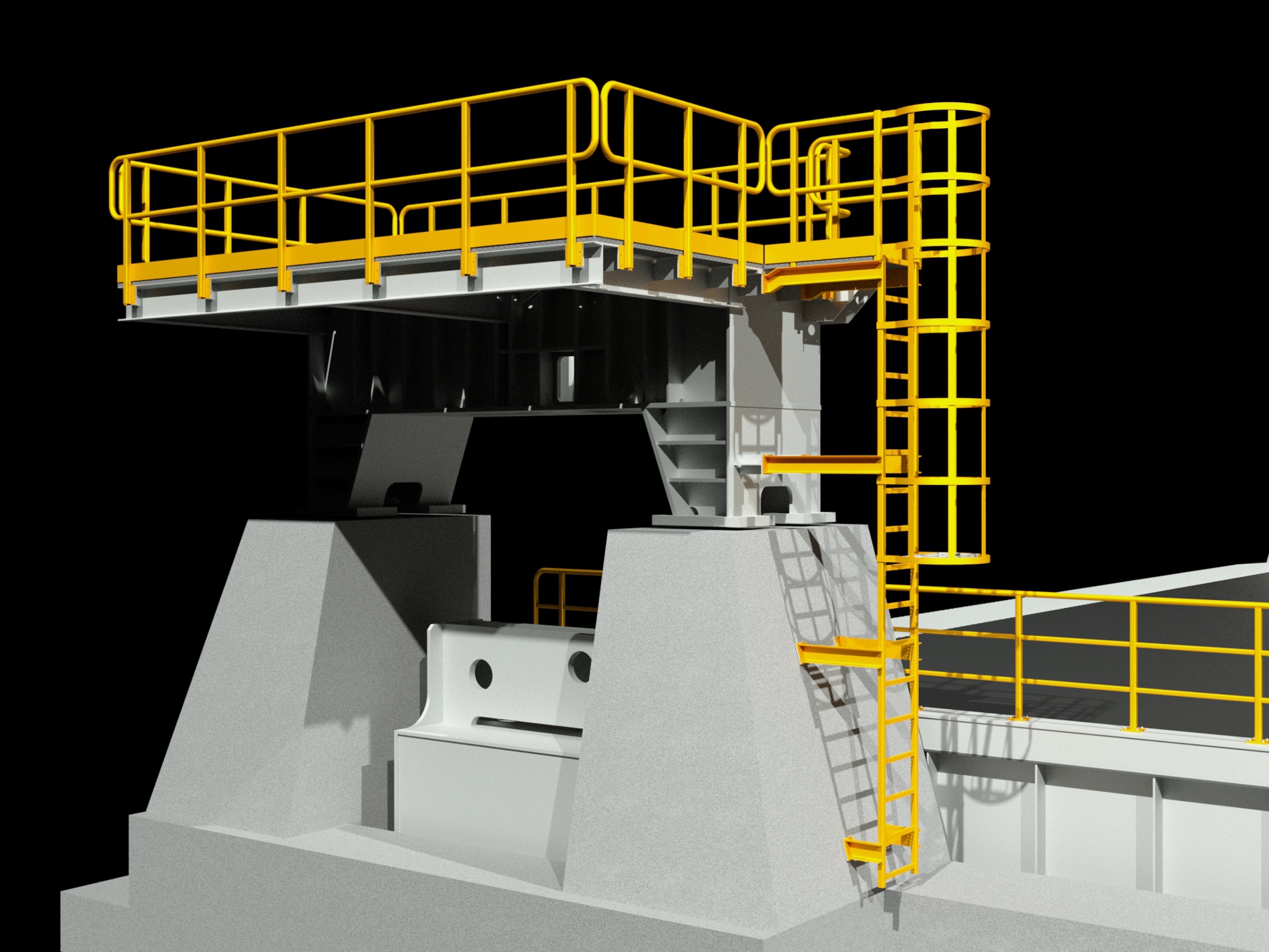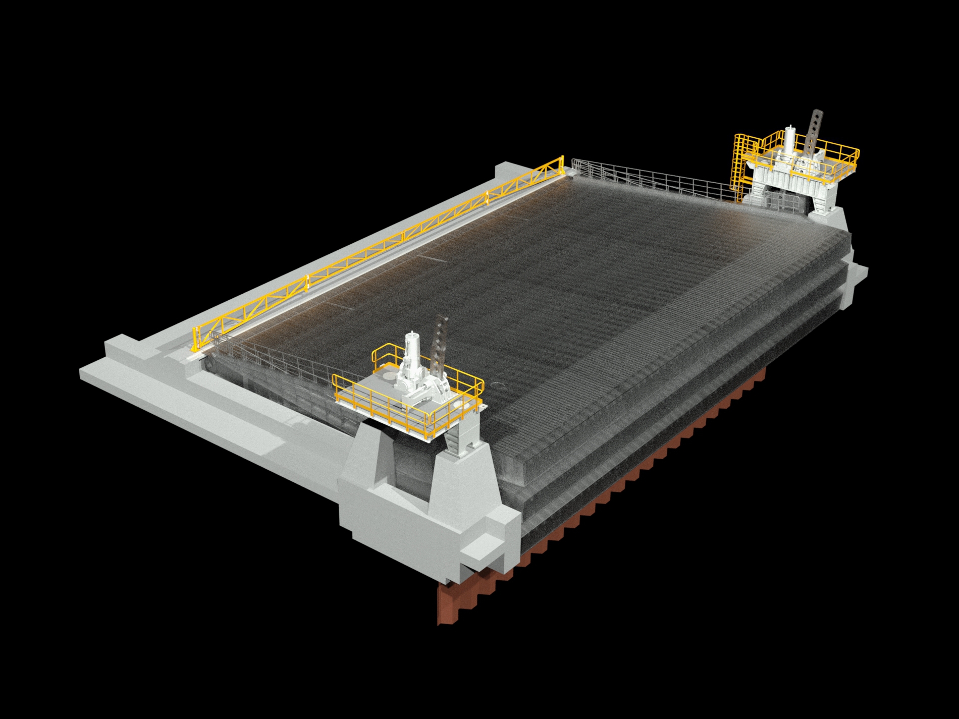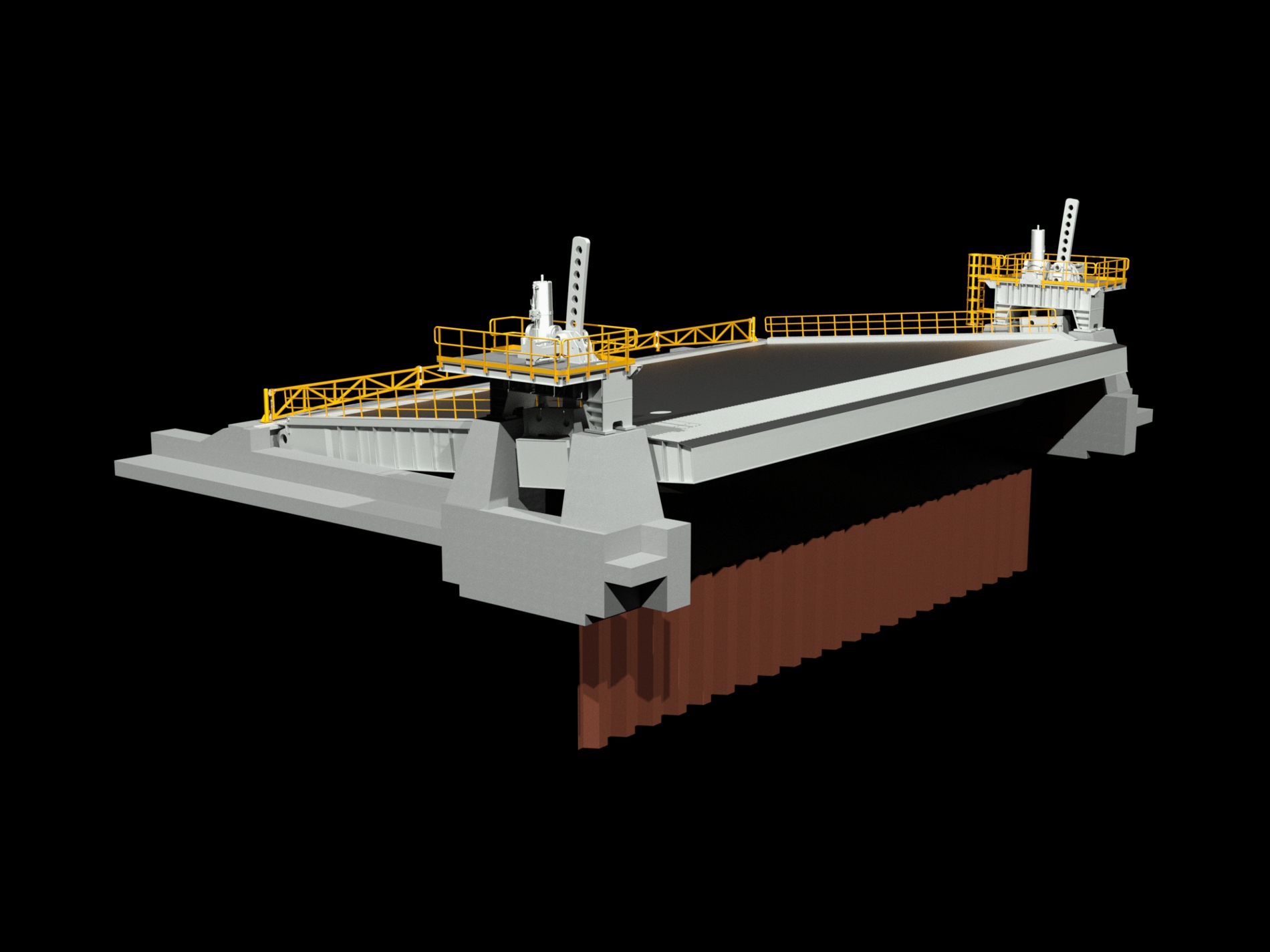 Projekt warsztatowy oraz projket montażu konstrukcji stalowej, pomostu ruchomego rampy Ro-Ro, realizowanej w ramach zadania inwestycyjnego: "Przystosowanie infrastruktury Terminalu Promowego w Świnoujściu do obsługi transportu intermodalnego". Projketowany pomost służy do załadunku i rozładunku jednostek pływających zacumowanych przy stanowsku promowym nr 5. Konstrukcję zaprojektowano w formie rusztu dźwigarów poprzecznych i podłużnych, z płytą ortotropową, z żebrami korytkowymi zamkniętymi, podpartą na poprzecznicach. Poprzecznice oparto na dźwigarach głównych, te z kolei oparte są, częściowo za pośrednictwem dźwigara poprzecznego podporowego, na łożyskach obrotowych na nabrzeżu (3 szt.) oraz od strony odwodnej, na dźwigarze poprzecznym, podwieszonym za pośrednictwem belki ryglowej do ramowych pylonów. Długość całkowita obiektu (głównego pomostu): 20,775 m, szerokość całkowita: 32,800 m. Konstrukcję zamodelowano i wytworzono z uwzględnieneim powierzchniowego podniesienia wykonawczego o wartości 16mm.